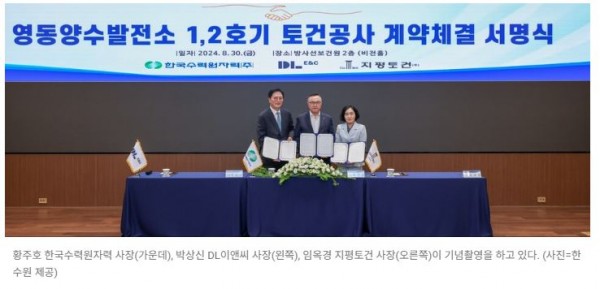 한수원-DL이앤씨·지평토건, 영동양수발전소 1,2호기 토건공사 계약 체결